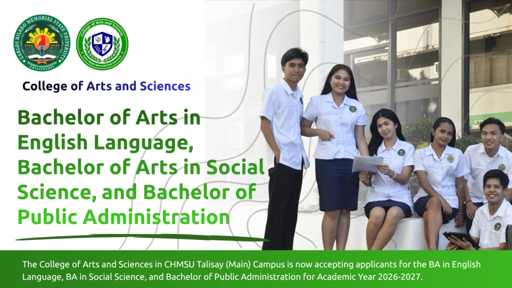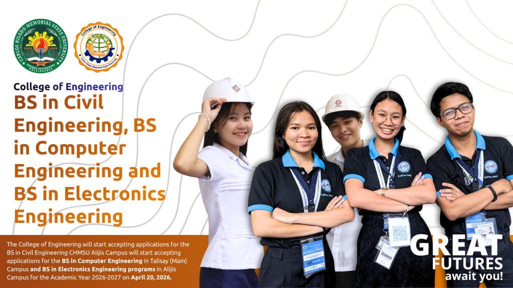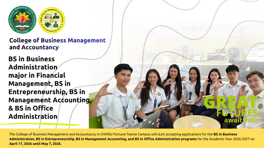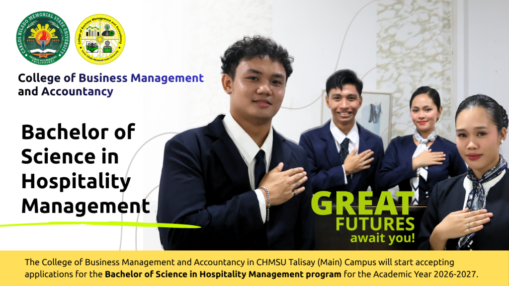 The College of Business Management and Accountancy in CHMSU Talisay (Main) Campus will start accepting applications for the Bachelor of Science in Hospitality Management program for the Academic Year 2026-2027. Applicants must meet the following qualifications: Primary Requirements: Important Dates: Application Period: April 20 – May 15, 2026 Announcement of Interview Qualifiers: Series of Announcements […]