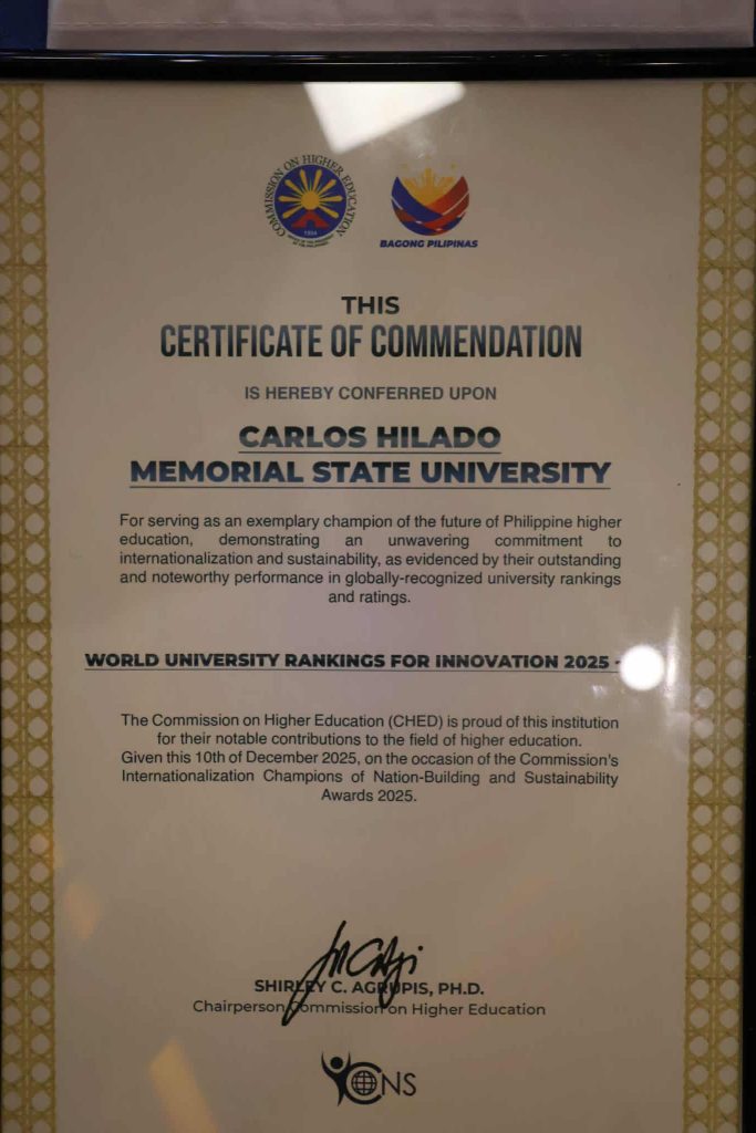 The Commission on Higher Education (CHED) honored Carlos Hilado Memorial State University during the Champions of Nation-Building and Sustainability (ICONS) Awards 2025 at the Philippine International Convention Center (PICC), Pasay City, December 10, 2025.